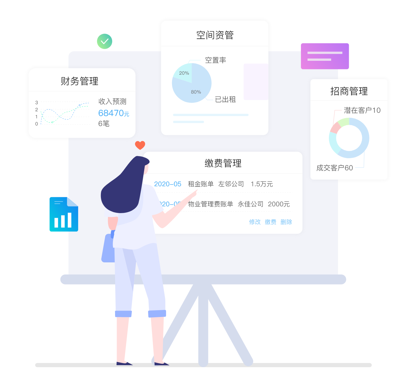 園區資產智能化管理,快速了解資產現狀,園區產值、稅收、入駐企業數、在租面積、企業名冊等